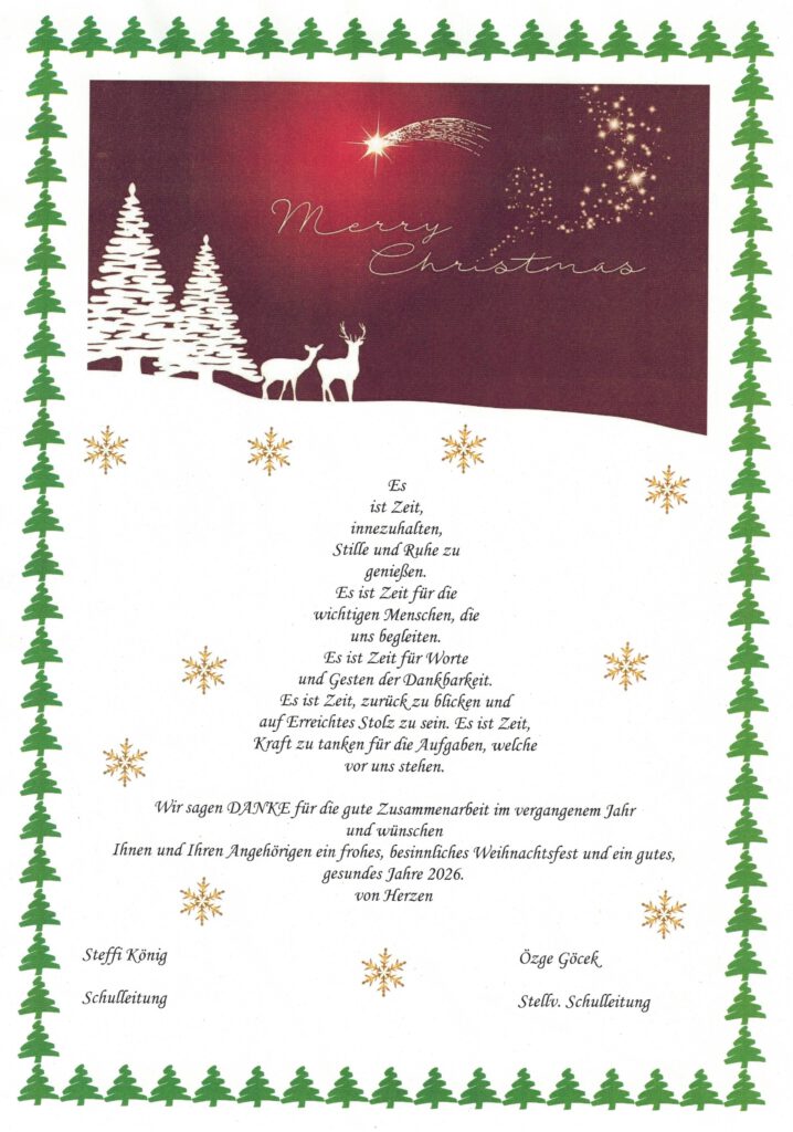 Allgemein Schöne Weihnachtsferien 19. Dezember 2025 / Liebe Eltern, Schülerinnen und Schüler sowie Freunde der Rheinbabenschule, wir wünschen Ihnen erholsame Weihnachtsferien und einen guten Start ins neue Jahr! Der 1. Schultag ist am Donnerstag, 08.01.2026, um 8:00 Uhr.